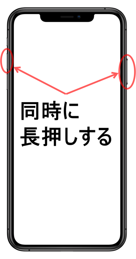 | ①ホームボタンと 電源右部サイドか上部ボタンを同時に約10秒長押しをする |