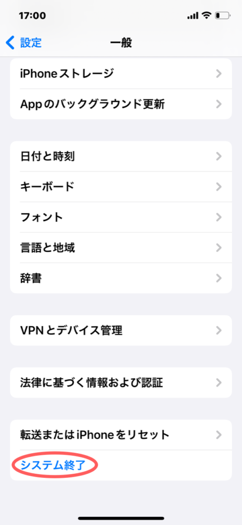 [設定]>[一般]の順で開き、最下部へスクロール[システム終了]>電源をスライドで電源オフ。